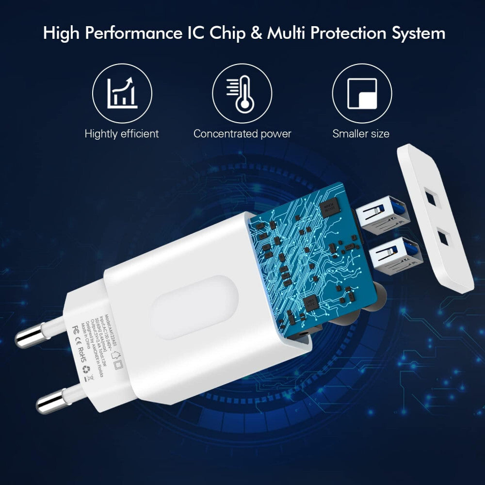 Amoner 12W Duální USB-A nástěnný nabíjecí adaptér se 2 ks 1m rychlonabíjecích kabelů – Spolehlivé a rychlé nabíjení pro iPhone a USB-A zařízení