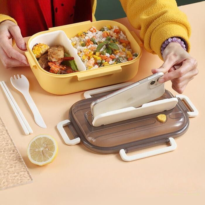 Praktický design umožňuje oddělení jídel, takže zůstanou čerstvá a chutná. Vestavěný úložný prostor na příbory nabízí hygienické a pohodlné řešení, které zároveň slouží jako stojánek na telefon, takže si během jídla můžete užívat své oblíbené obsah. -