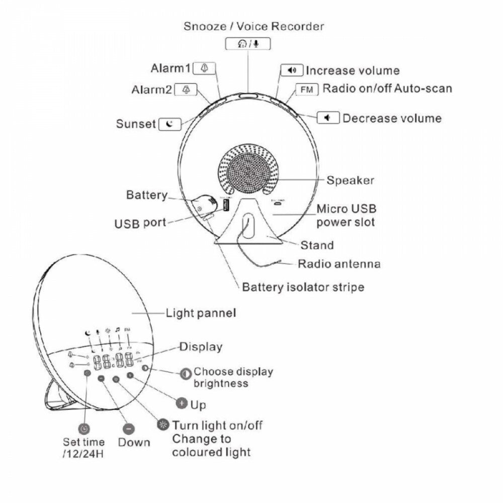 - Vestavěné FM rádio a přírodní zvuky: Probuďte se za zvuku oblíbené hudby, zpráv nebo relaxačních přírodních zvuků.