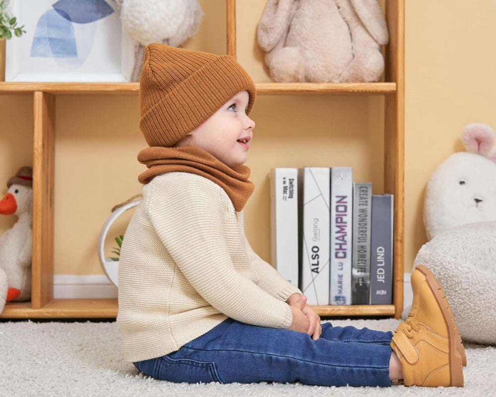 - AHAHA Čepice a Kruhový Šál Sada pro Malé Děti - Velikost M, Hnědá, Teplý Zimní Doplňek