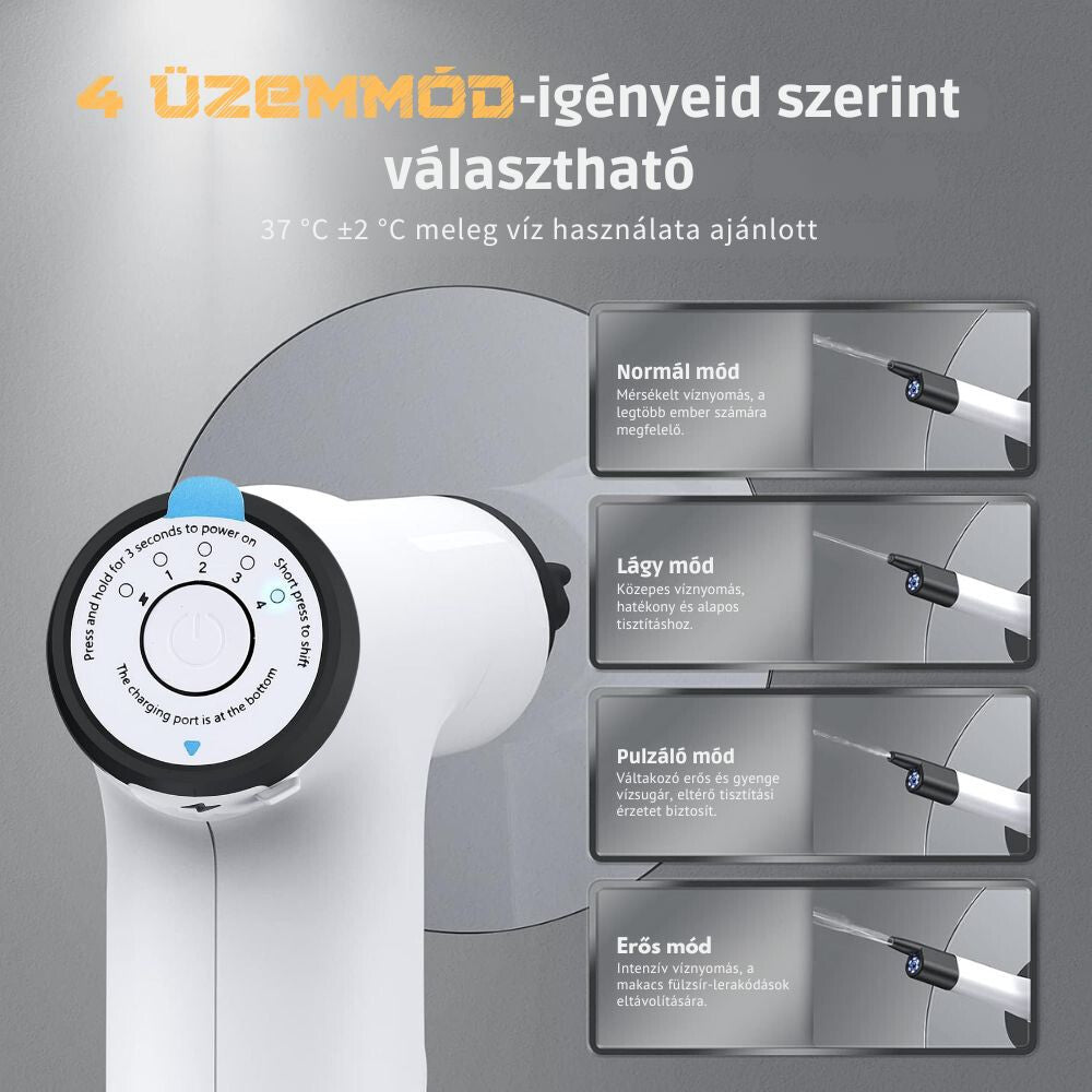 Zařízení má čtyři různé stupně tlaku (šetrný, normální, pulzující a silný), takže si každý může vybrat nastavení, které mu nejvíce vyhovuje. Nižší stupně jsou doporučeny pro citlivé uši a pravidelné čištění, zatímco silnější režimy pomáhají odstranit odolnější ušní maz. Vodní paprsek zajišťuje rovnoměrné a kontrolované oplachování.