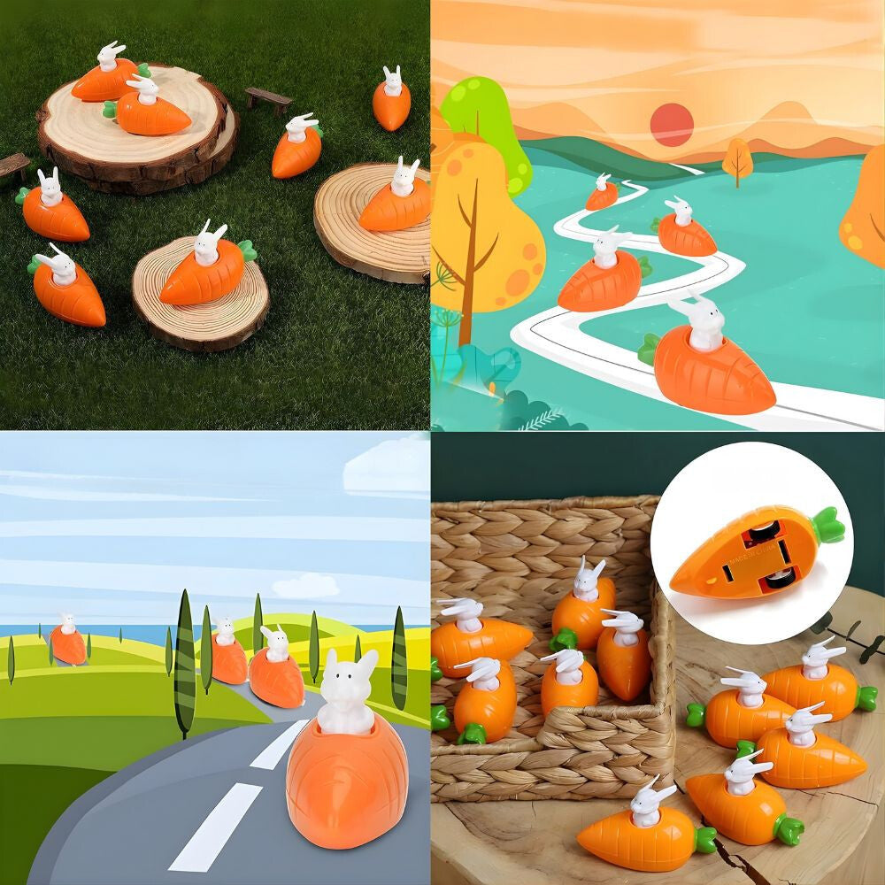 Dlouho ušní králíček sedí v malém vozíku s mrkví, který stačí táhnout dozadu po hladkém povrchu a po uvolnění rychle vyrazí vpřed.