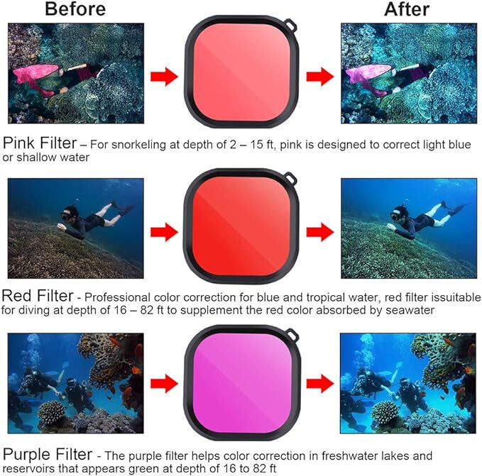 KOMPATIBILITA - Vhodné pouze pro oficiální vodotěsné pouzdro GoPro Hero 8 Black. Nepoužívejte na jiná vodotěsná pouzdra. Na trhu jsou různé verze vodotěsných pouzder. Pro správný výběr filtru prosím porovnejte pouzdra podle obrázků.