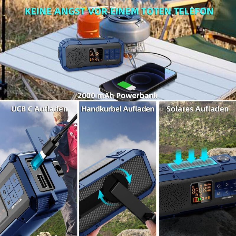 K KAYINOW 5 v 1 klikacím solárním rádiu je nepostradatelným společníkem pro outdoorové nadšence, turisty a kempingové nadšence. Toto všestranné, praktické a odolné zařízení kombinuje AM/FM rádio, Bluetooth reproduktor, 2000 mAh power banku, kapesní svítilnu a SOS nouzový signál, aby vás udrželo v bezpečí a ve spojení za všech situací.