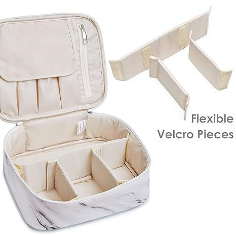 - Pružné přepážky na suchý zip – 3 malé přihrádky a 1 velká přihrádka pro uspořádané uložení make-upu
