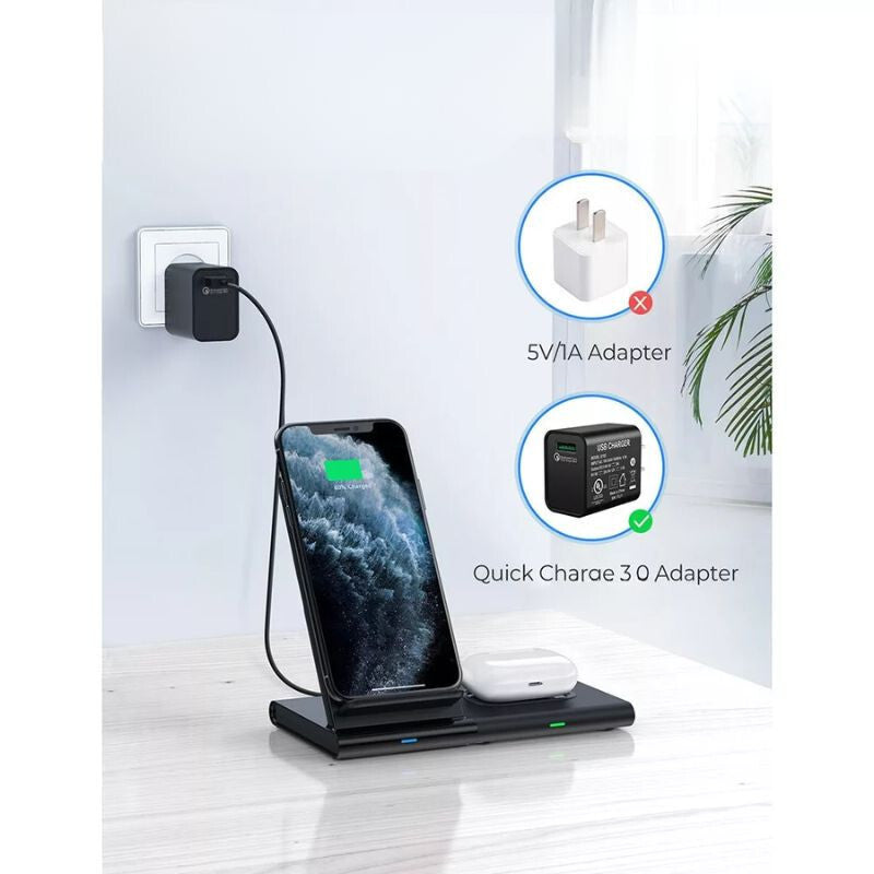 - Toto dvojité bezdrátové nabíjení je vynikajícím řešením, pokud chcete současně rychle a pohodlně nabíjet dvě zařízení. Nabíječka s protiskluzovým povrchem spolehlivě drží vaše zařízení na místě, zatímco funkce rychlého nabíjení zajistí jejich dobití během minimální doby.