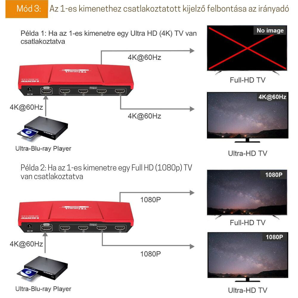 - TESmart HDMI splitter umožňuje současné zobrazení obrazu z jednoho HDMI zdroje až na čtyřech displejích se zcela stejným obsahem. Ideální řešení pro prezentace, obchody, zasedací místnosti, digitální reklamní plochy, výuku nebo domácí multimediální systémy.