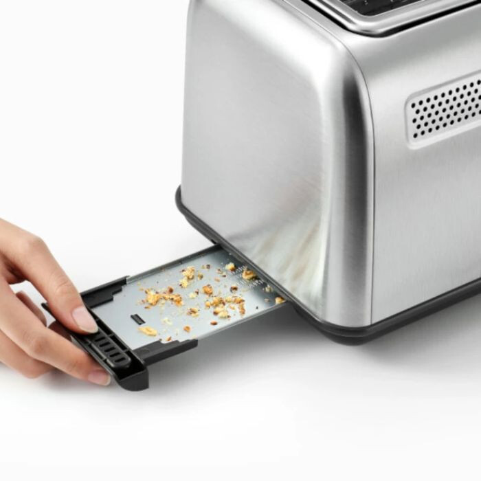 Přístroj usnadňuje každodenní používání díky praktickým řešením: zvedací páčka pro snadné vyjímání plátků, odnímatelná miska na drobky pro rychlé čištění, kryt proti prachu a vestavěný organizér kabelu pro lepší úhlednost.