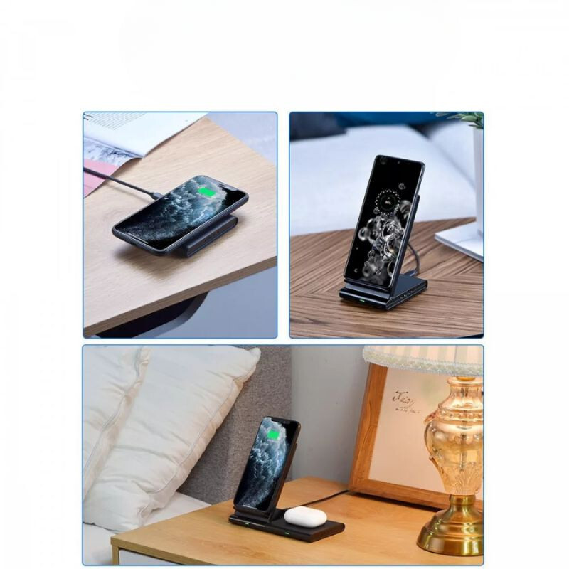 Bezdrátový nabíjecí stojánek pro 2 zařízení, díky vestavěnému rychlému adaptéru je vhodný pro nabíjení dvou telefonů současně až do 10 wattů.Podporuje nabíjení telefonu při sledování videí vleže nebo ve stoje pro zasílání zpráv a rozpoznávání obličeje.