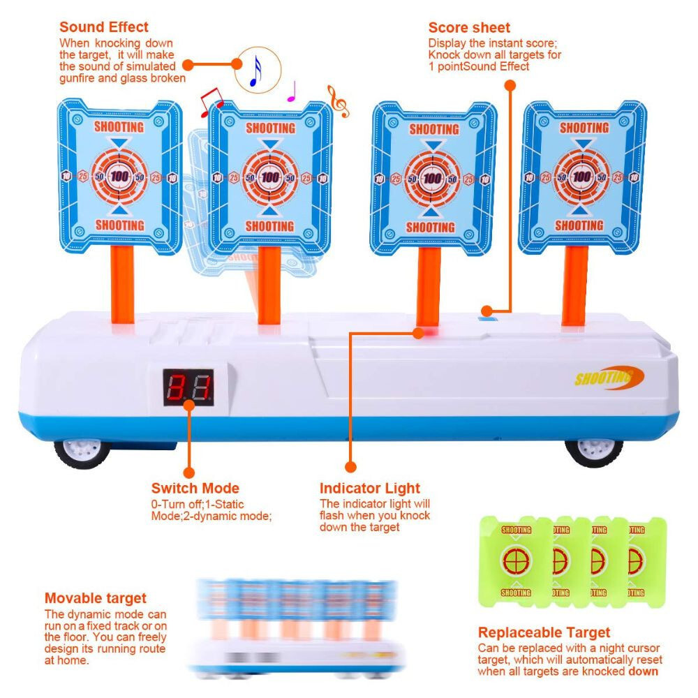 Dva herní režimy: terč má dva režimy, pohyblivý a stacionární. Pohyblivý režim ztěžuje zasažení cíle. Terč je vhodný pro všechny druhy pěnových střel, šipek a diabolek.